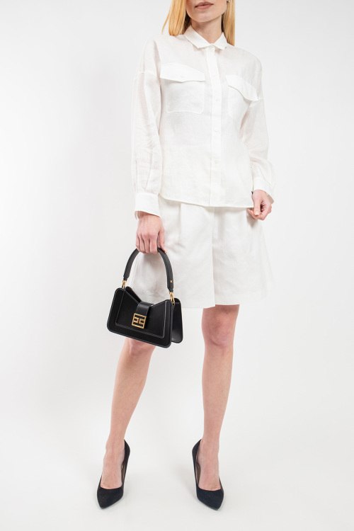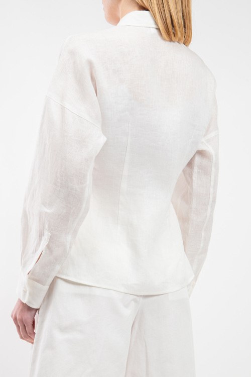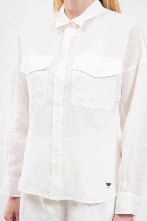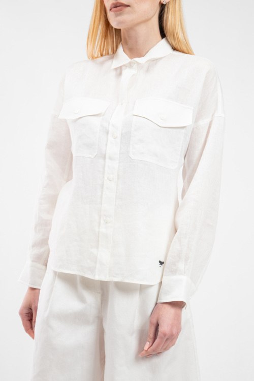 Женская белая льняная рубашка Spoleto от Max Mara Weekend (Макс Мара Викенд). Отложной воротник, два накладных кармана на груди, вышитый логотип, застежка на пуговицы, манжеты на пуговицах, классическая длина.