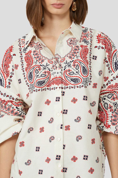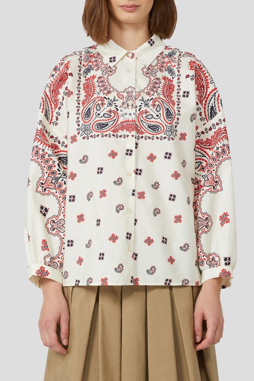 Детали: Женская белая хлопковая рубашка Adda от Max Mara Weekend (Макс Мара Викенд). Восточный узор, отложной воротник, застежка на пуговицы, широкий рукав, классическая длина