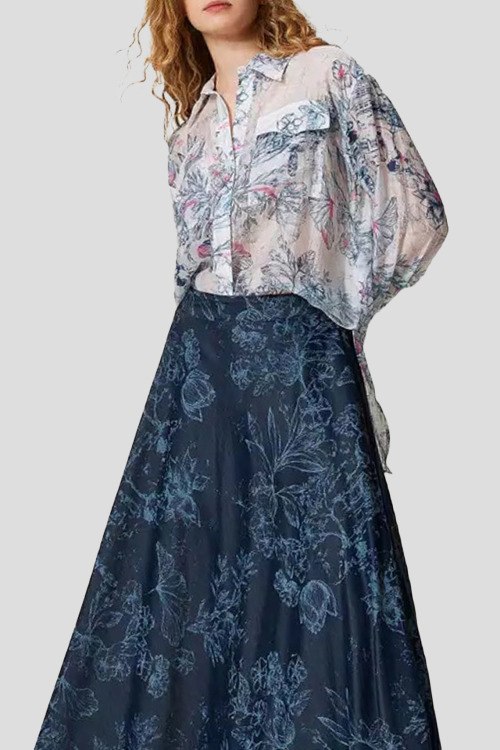 Детали: Женская белая рубашка из лиоцелла и полиамида от TWINSET (Твинсет). Классический воротник, застежка на пуговицы, длинны рукава, модель декорирована принтом по всей поверхности изделия