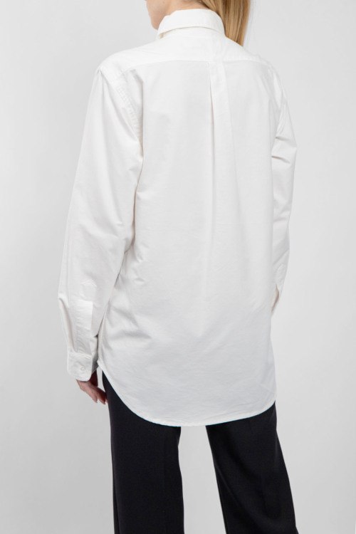 Женская белая хлопковая рубашка от Ralph Lauren (Ральф Лорен). Вышитый логотип на груди, отложной воротник, застежка на пуговицы, манжеты на пуговицах, удлиненная длина.