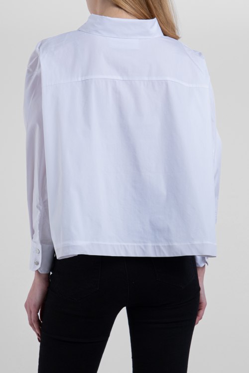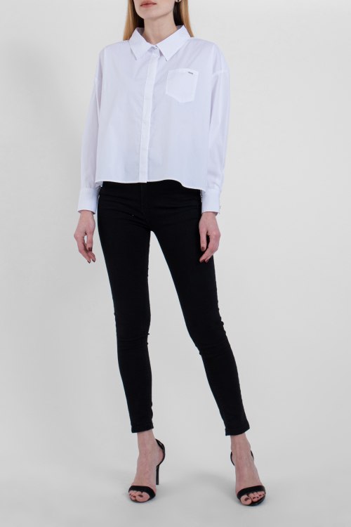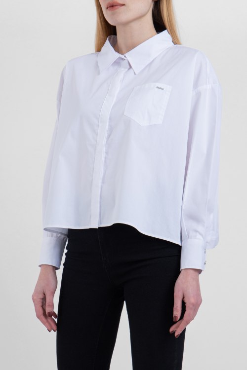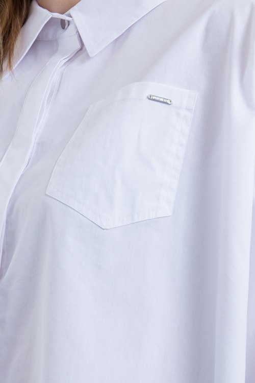 Женская белая рубашка из хлопка от Silvian Heach (Сильвиан Хич). Укороченная длина, свободный силуэт, отложной воротник, длинные рукава, спущенное плечо, скрытая линия застежки, манжеты на пуговицах, на груди карман с логотипом.