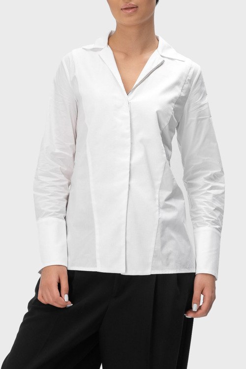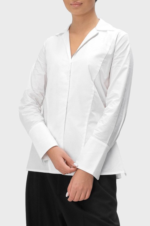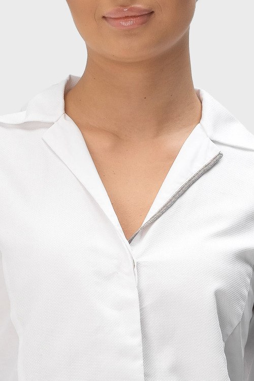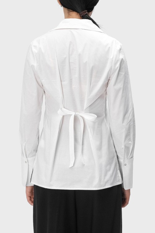 Детали: Женская белая рубашка из хлопка от Tonet (Тонет). V-образный вырез горловины, классический воротник, потайная застежка на пуговицы, длинные рукава, завязки сзади