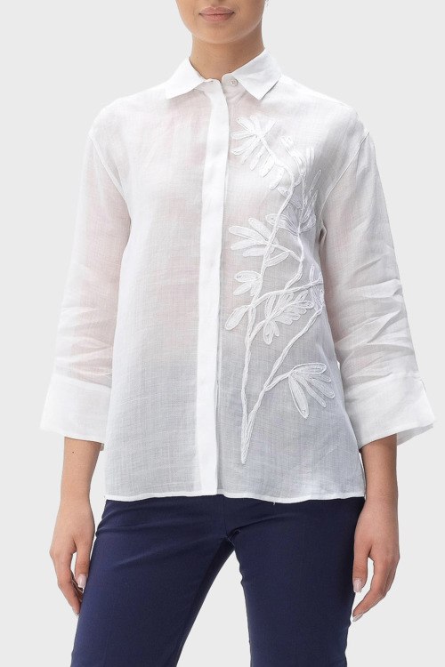 Детали: Женская белая рубашка из рами т Tonet (Тонет). Классический воротник, потайная застежка на пуговицы, укороченные рукава, модель декорирована аппликацией в тон изделия, по бокам разрезы