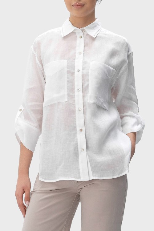 Детали: Женская белая рубашка из рами от Tonet (Тонет). Классический воротник, застежка на молнию, укороченные рукава, нагрудные карманы, по бокам разрезы, фигурный низ изделия