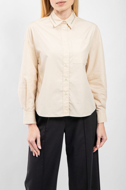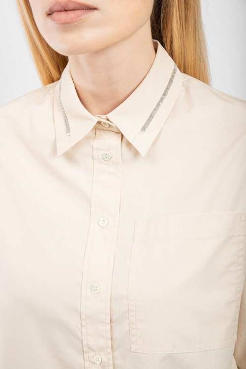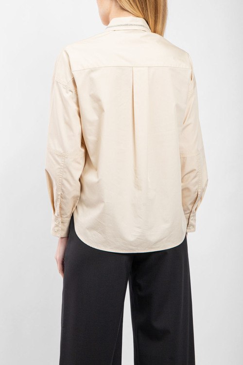 Детали: Женская бежевая хлопковая рубашка от Brunello Cucinelli (Брунелло Кучинелли). Отложной воротник, накладной карман на груди, застежка на пуговицы, манжеты на пуговицах, классическая длина