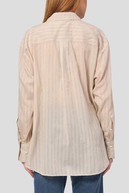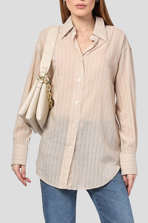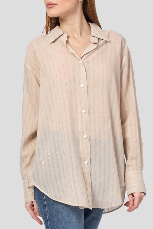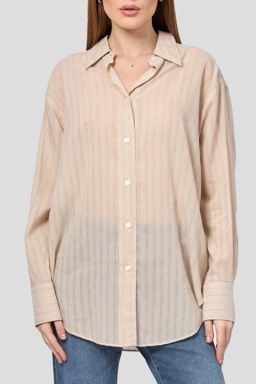 Детали: Женская бежевая рубашка из хлопка и вискозы от Hugo Boss (Хуго Босс). Дизайн в полоску, классический воротник, застежка на пуговицы, длинные рукава, фигурный низ изделия