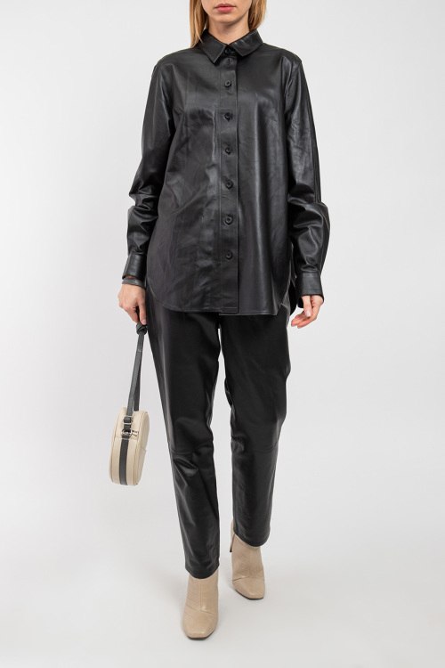 Женская черная рубашка из натуральной кожи от Arma (Арма). Классический воротник, застежка на пуговицы, длинные рукава, манжеты на пуговице, удлиненная длина по спинке.