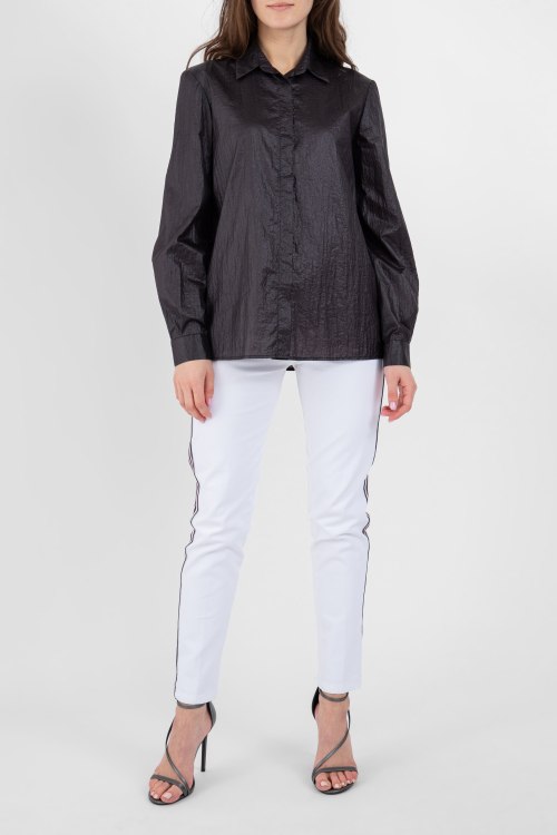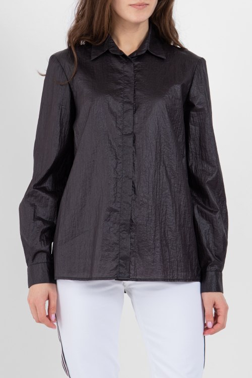Женская черная рубашка от Frankie Morello (Франки Морелло). Жатая ткань, отложной воротник, застегивается на кнопки, манжеты на кнопках.