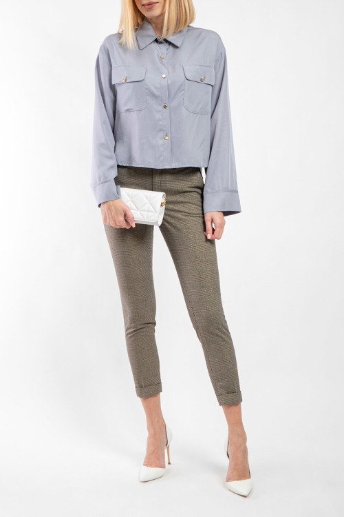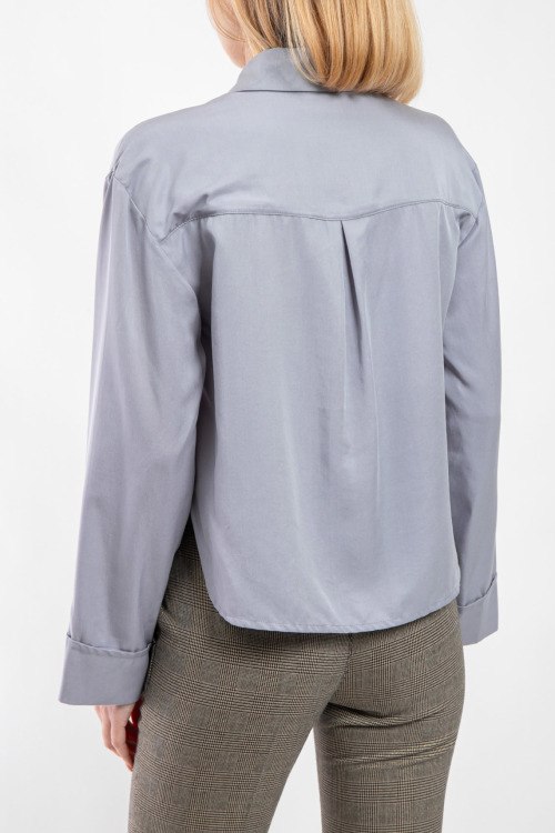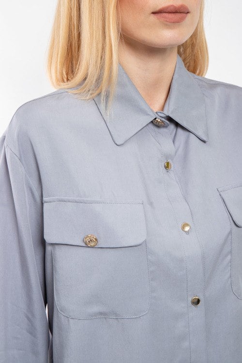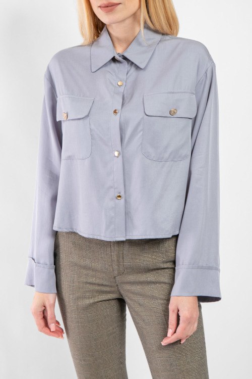 Женская голубая рубашка от Barbara Alvisi (Барбара Алвиси). Классический воротник, застежка на золотистые пуговицы, длинные расклешенные рукава, фигурный низ изделия, нагрудные карманы. Замеры для размера 44: длина: 49 см, ширина по груди: 17 см, ширина по талии: 16 см.