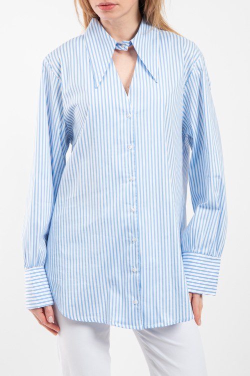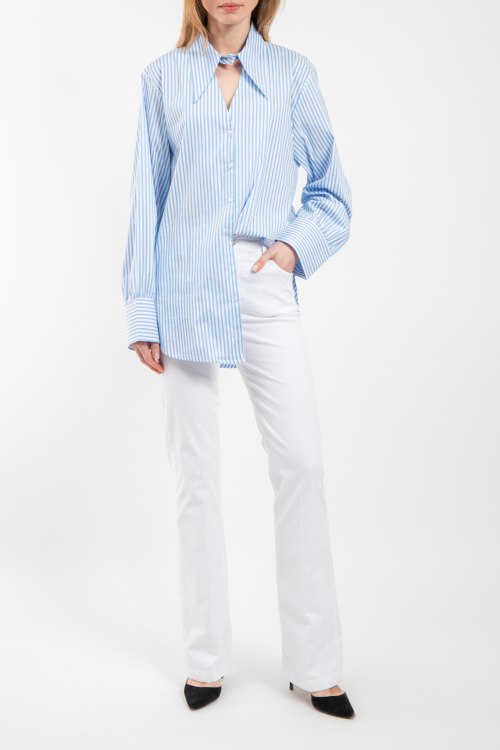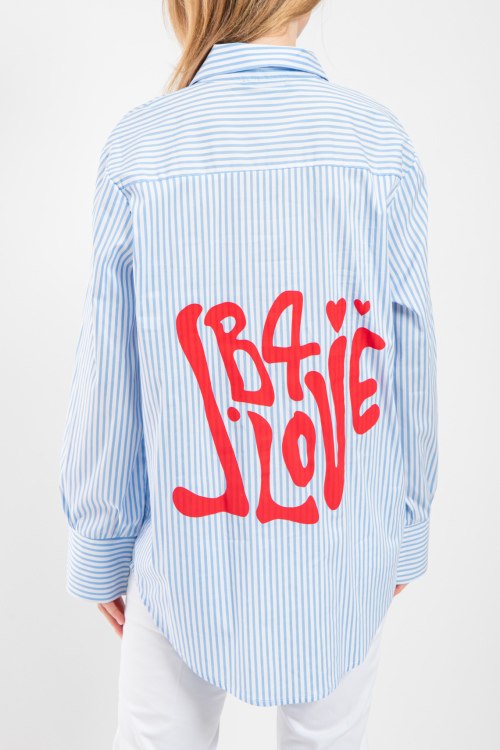 Женская голубая рубашка из хлопка от J.B4 Just Before (Джаст Бифо). Удлиненная модель, классический воротник, V-образный вырез горловины, застежка на пуговицы, длинные рукава, манжеты на пуговицы, фигурный низ изделия, брендированный принт на спине.
