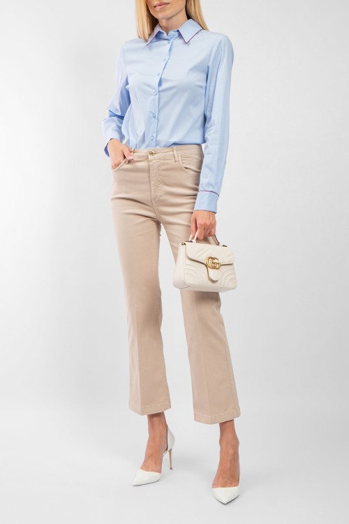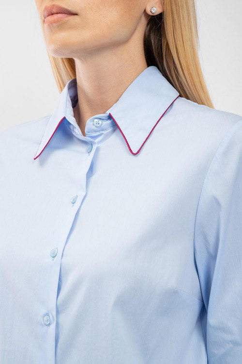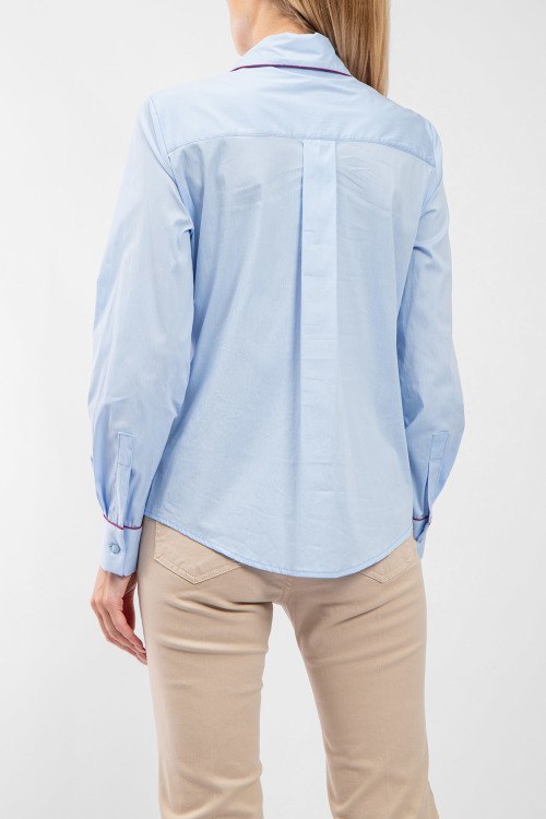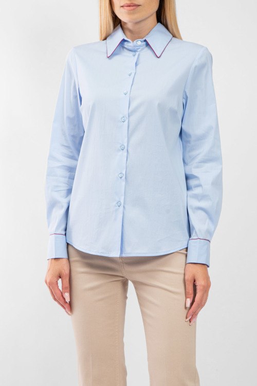 Женская голубая хлопковая рубашка от Kocca (Кокка). Отложной воротник, застежка на пуговицы, манжеты на пуговицах, закругленный нижний край, классическая длина.