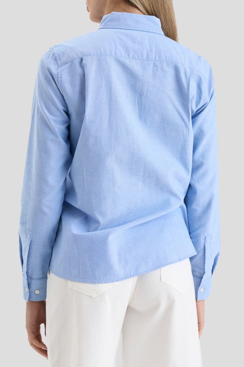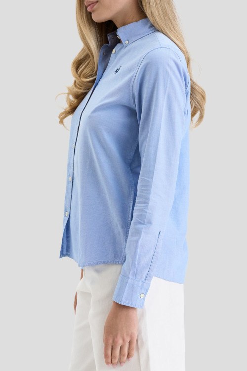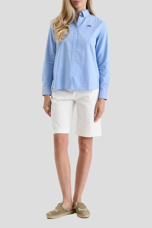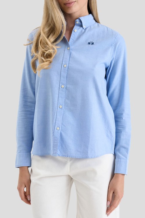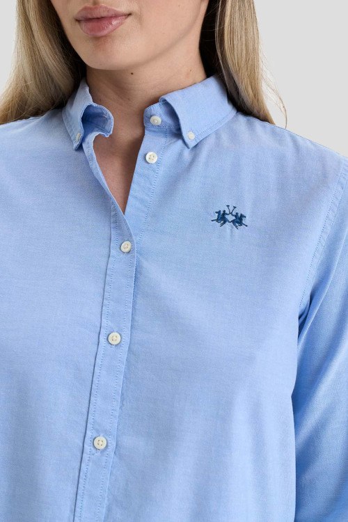 Детали: Женская голубая хлопковая рубашка от La Martina (Ла Мартина). Логотип на груди, отложной воротник, застежка на пуговицы, манжеты на пуговицах, классическая длина, закругленный нижний край