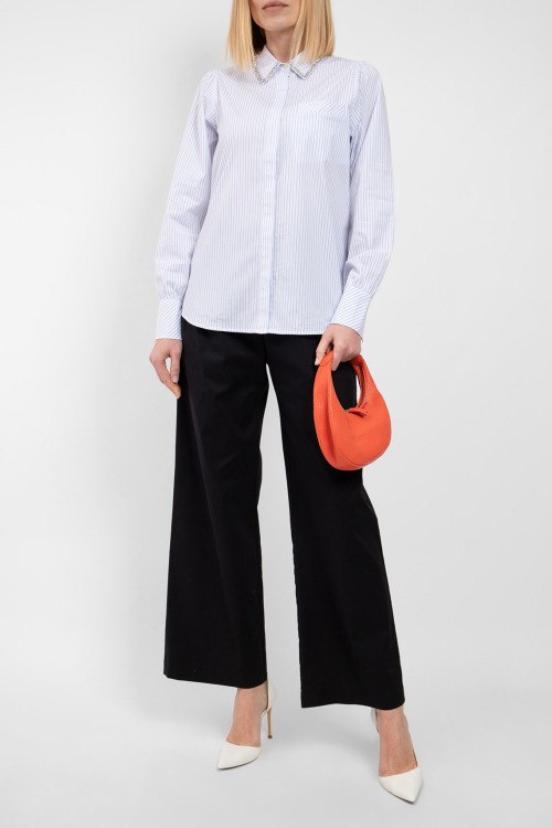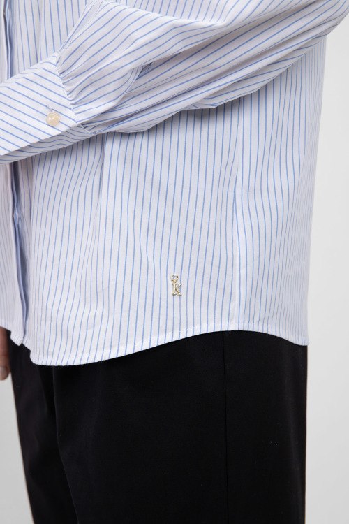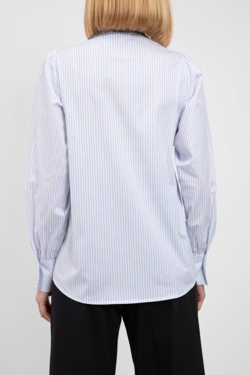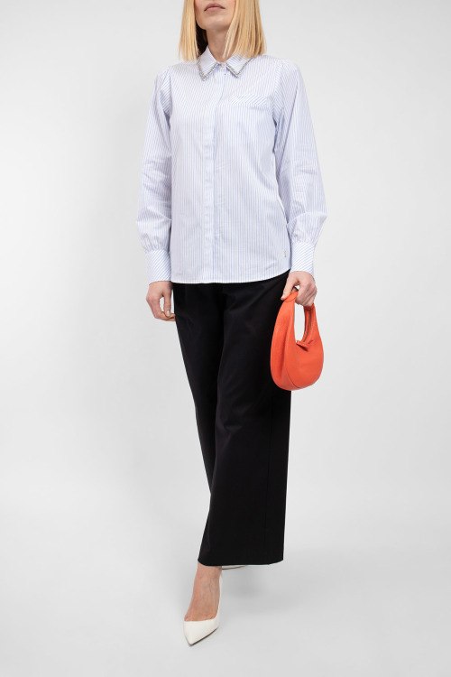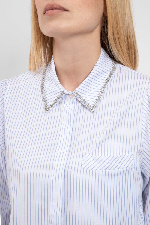 Женская белая рубашка из хлопкового микса от Kocca (Кокка). Классический воротник с кристаллами, дизайн в мелкую полоску голубого цвета, потайная застежка на пуговицы, длинные рукава, фигурный низ изделия, манжеты на пуговицах, металлический логотип бренда.