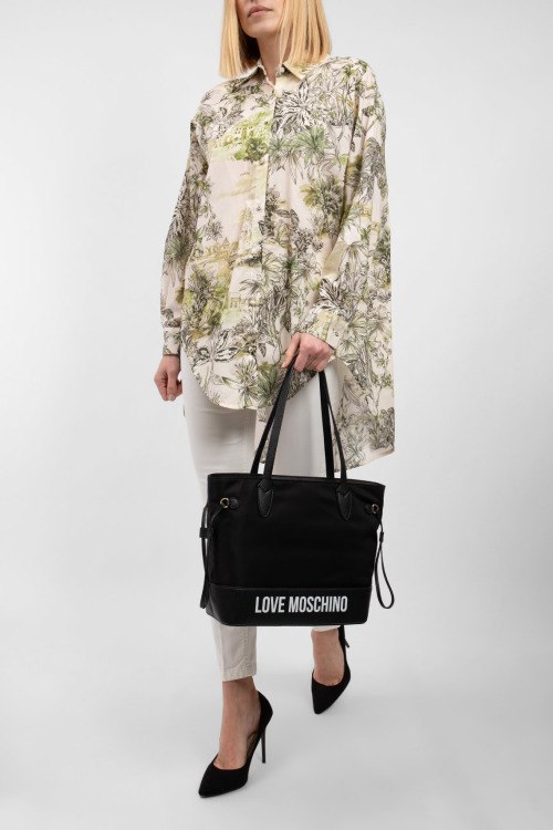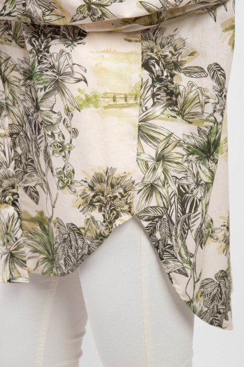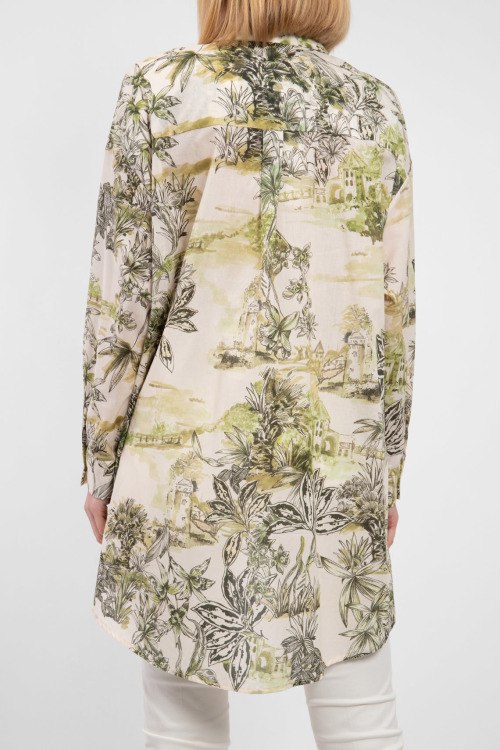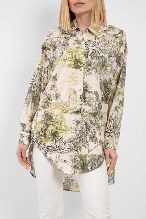 Женская рубашка из хлопка от Kocca (Кокка). Дизайн с принтом по всей поверхности изделия, модель oversizе, классический воротник, застежка на пуговицы, удлиненная модель, фигурный низ изделия, длинные рукава.