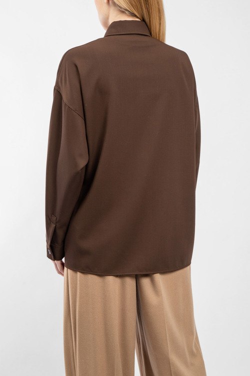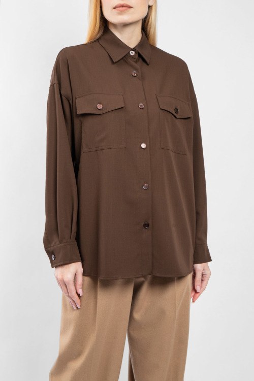 Женская темно-коричневая шерстяная рубашка Firmina от Max Mara Weekend (Макс Мара Викенд). Отложной воротник, два кармана на груди, застежка на пуговицы, манжеты на пуговицах, удлиненная длина.