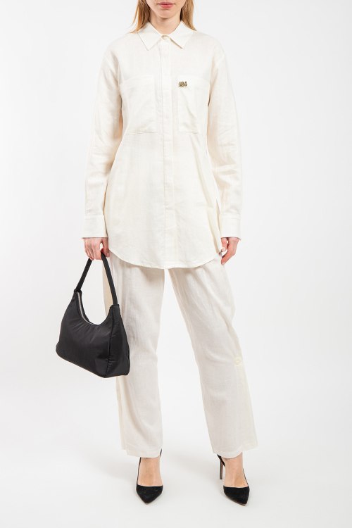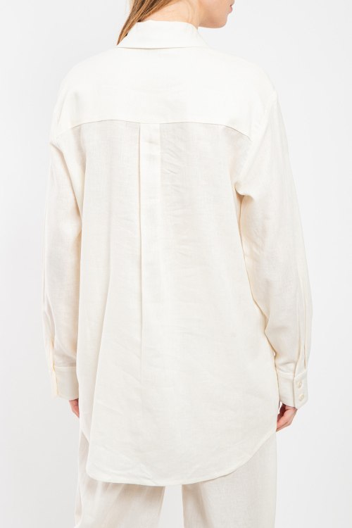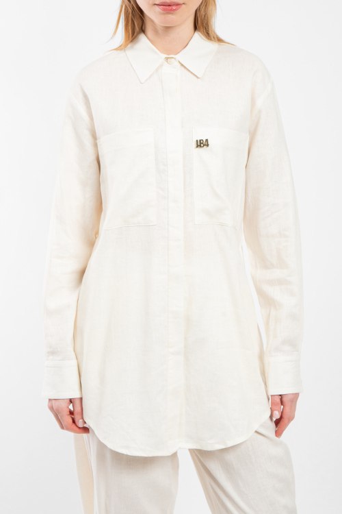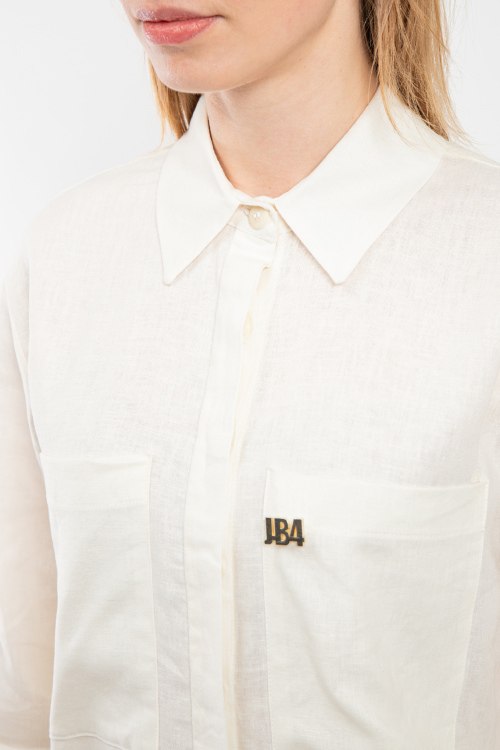 Женская рубашка молочного оттенка из льняного микса от J.B4 Just Before (Джаст Бифо). Удлиненная модель, классический воротник, застежка на пуговицы, нагрудные карманы, логотип бренда, длинные рукава, манжеты на пуговице, фигурный низ изделия.