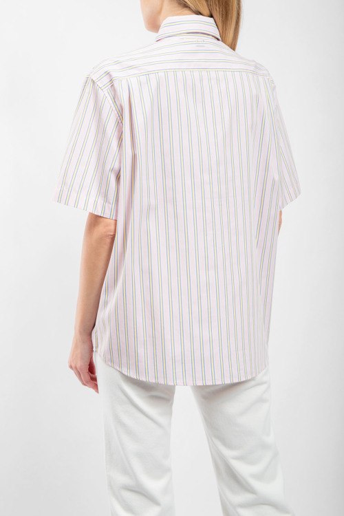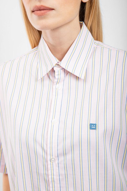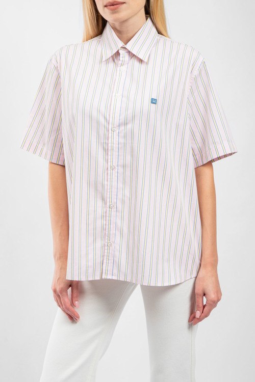 Детали: Женская бледно-розовая хлопковая рубашка от Acne Studios (Акне Студиос). Полоска по всей поверхности, отложной воротник, короткий рукав, застежка на пуговицы, классическая длина