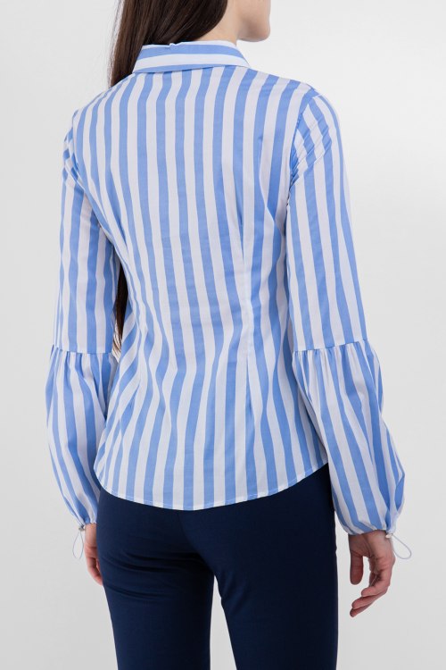 Женская рубашка в бело-голубую полоску из хлопкового микса от Trussardi (Труссарди). Классическая длина, отложной воротник, застежка на пуговицы, длинные рукава, манжеты затягиваются на кулиску.