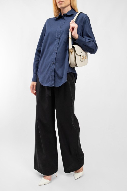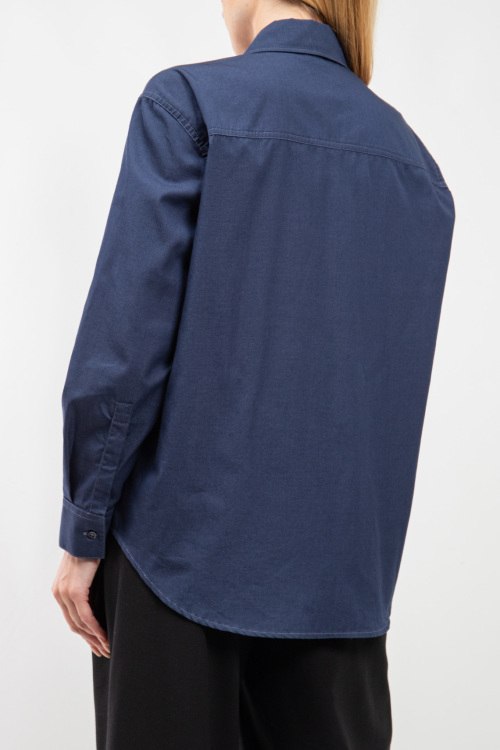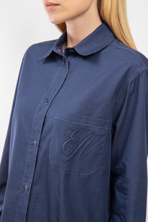 Женская темно-синяя хлопковая рубашка от Emporio Armani (Эмпорио Армани). Карман с вышитым логотипом на груди, отложной воротник, застежка на пуговицы, манжеты на пуговицах, удлиненная длина.