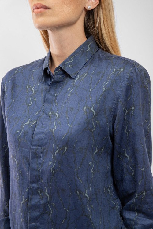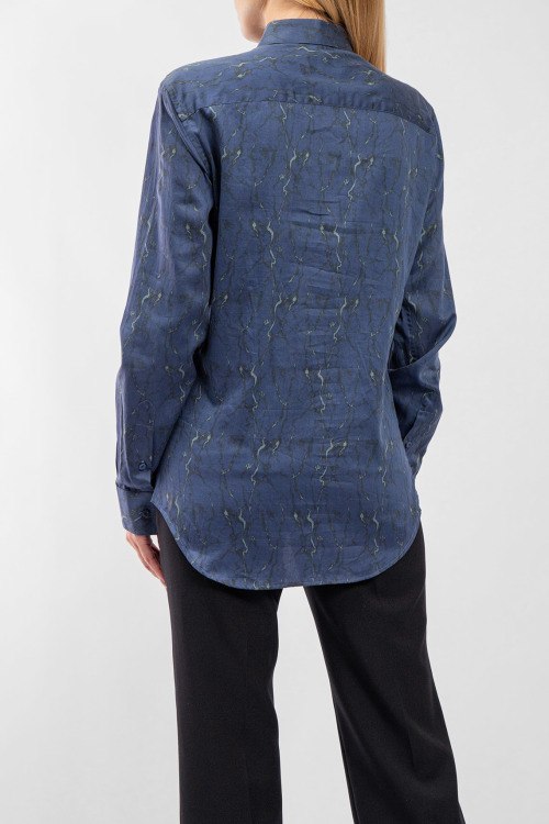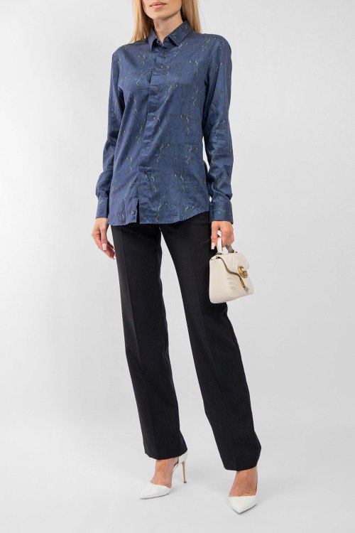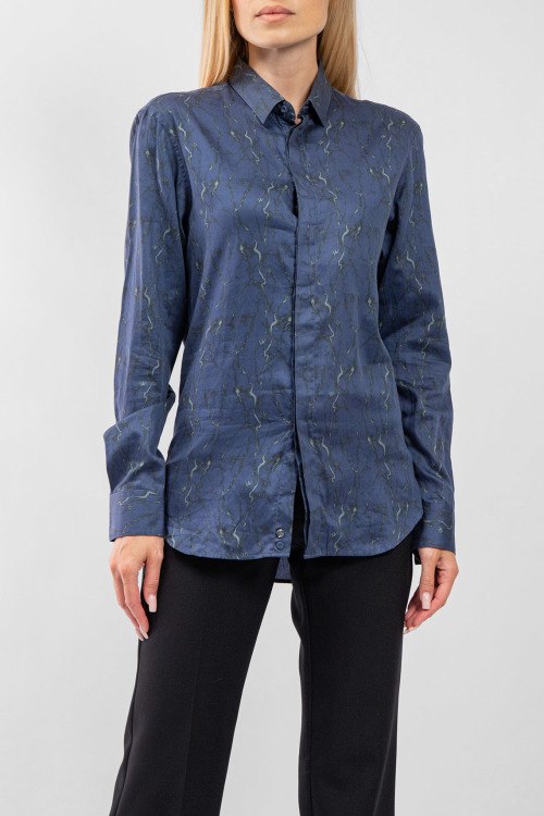 Женская темно-синяя хлопковая рубашка от Emporio Armani (Эмпорио Армани). Принт по всей поверхности, отложной воротник, скрытая застежка на пуговицы, манжеты на пуговицах. удлиненная длина.