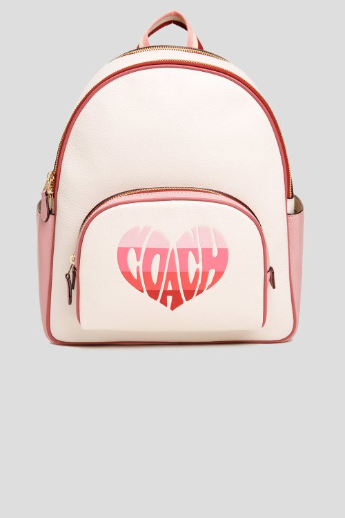 Женский белый рюкзак из натуральной кожи от Coach (Коуч). Два основных отделения, дополнительный карман на молнии, внутри текстильная подкладка, фурнитура золотистого цвета, принт с логотипом бренда, дизайн в виде комбинации цветов