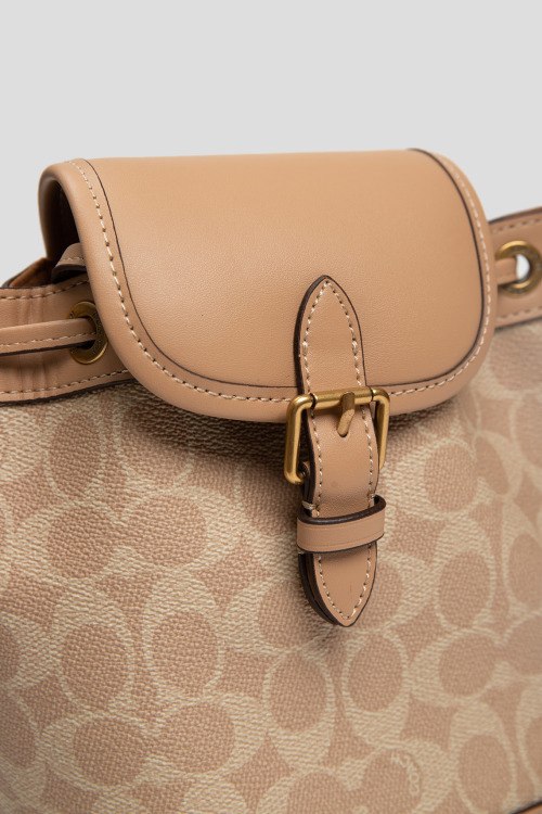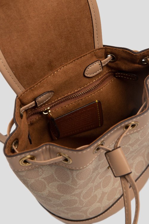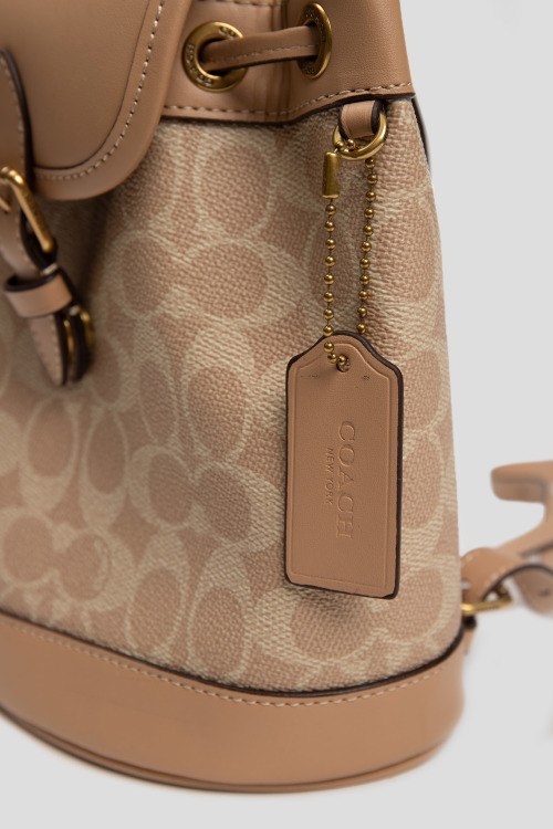 Детали: Женский бежевый рюкзак из натуральной кожи от Coach (Коуч). Застежка на кулиску, клапан и ремешок, золотистая фурнитура, регулируемые плечевые ручки, ручка для носки в руке, одно отделение, внутренний карман на молнии, принт логотипа. Размеры: 17 х 20 х 10 см