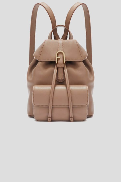 Детали: Женский бежевый кожаный рюкзак Flow от Furla (Фурла). Модель из гладкой кожи, значок логотипа, золотистая фурнитура, верх на затяжке, круглая ручка, регулируемые плечевые ремни, одно отделение. Размеры: 13.5/17 x 18,5 x 8 см