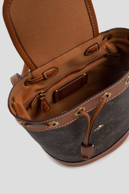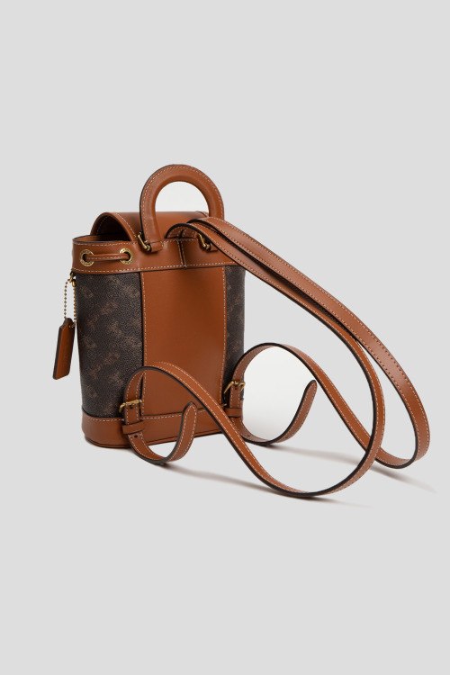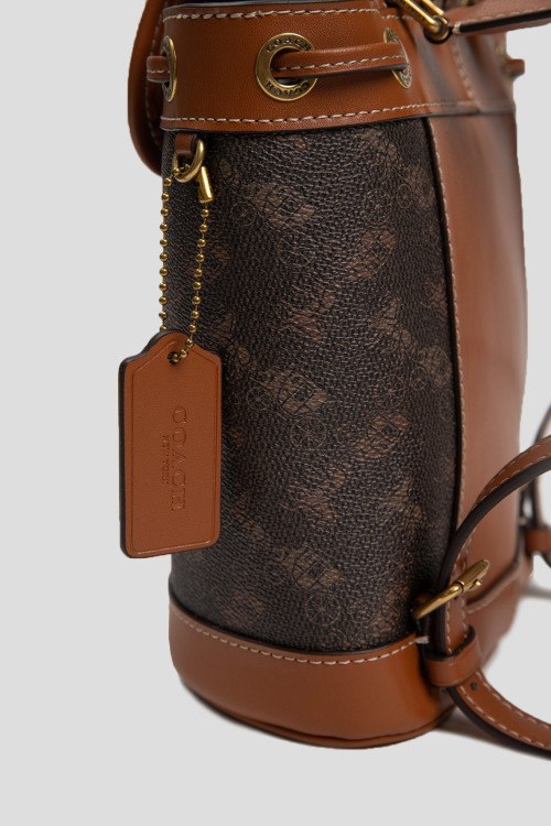 Детали: Женский темно-коричневый рюкзак из натуральной кожи от Coach (Коуч). Застежка на кулиску, клапан и ремешок, золотистая фурнитура, регулируемые плечевые ручки, ручка для носки в руке, одно отделение, внутренний карман на молнии, принт логотипа. Размеры: 17 х 20 х 10 см