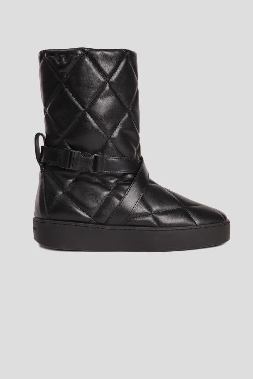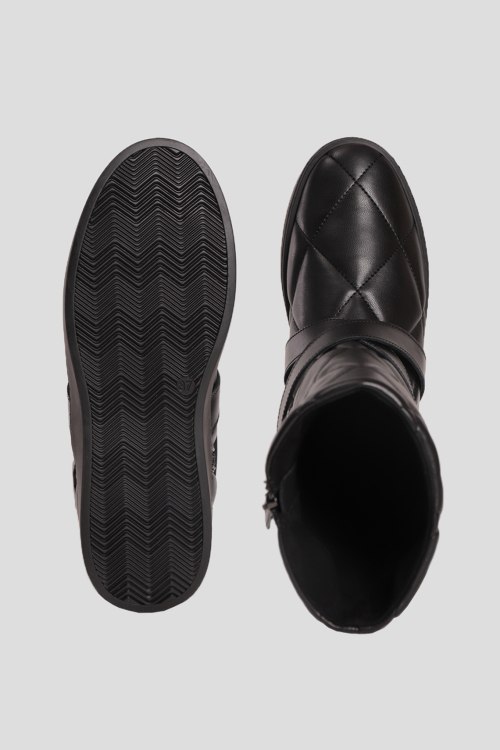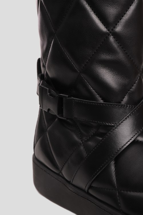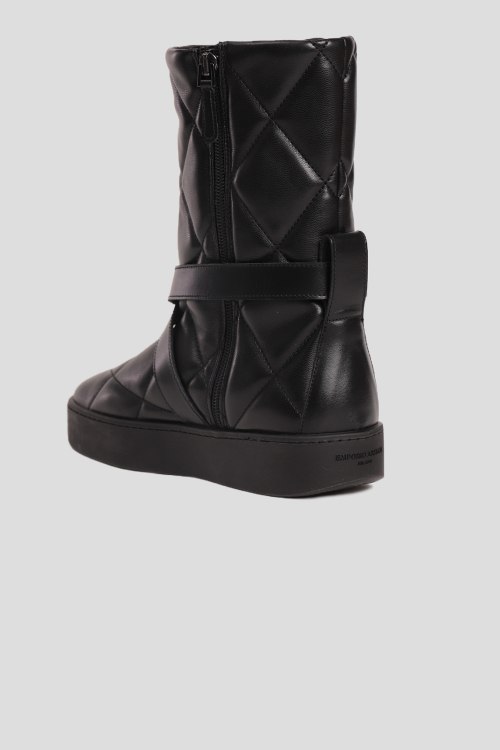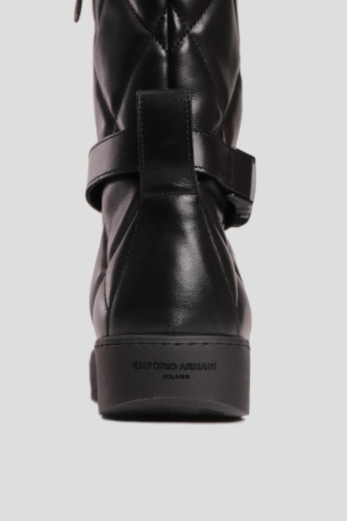 Детали: Женские черные кожаные полусапоги от Emporio Armani (Эмпорио Армани). Модель из гладкой кожи, стеганый дизайн, пряжка на щиколотке, застежка-молния сбоку, закругленный носок. Высота подошвы: 3,5 см