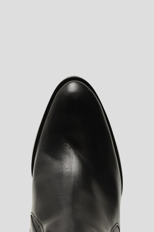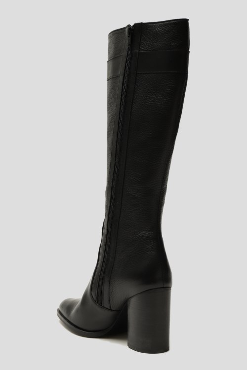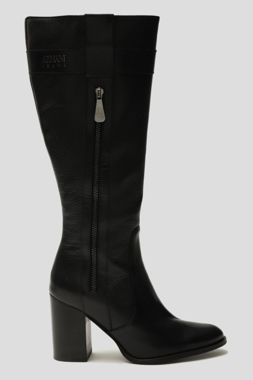 Детали: Женские черные сапоги из натуральной кожи от Armani Jeans (Армани Джинс). Миндалевидный носок, сбоку застежка-молния, по верху ремень в тон изделия с теснением логотипа бренда, высокий устойчивый каблук. Измерения: высота каблука: 9 см, высота голенища: 36,5 см, полуобхват голенища: 18 см