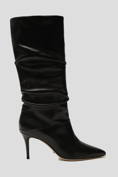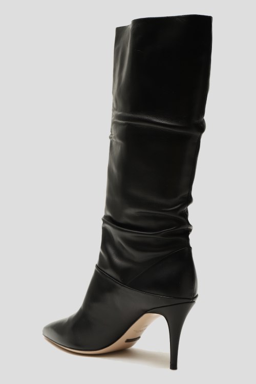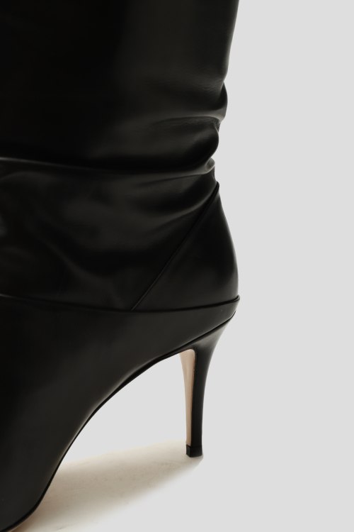 Детали: Женские черные сапоги из натуральной кожи от Sebastian (Себастиан). Острый носок, каблук-шпилька, дизайн со складками по щиколотке. Измерения: высота каблука: 8 см, высота голенища: 32,5 см, полуобхват голенища: 18 см
