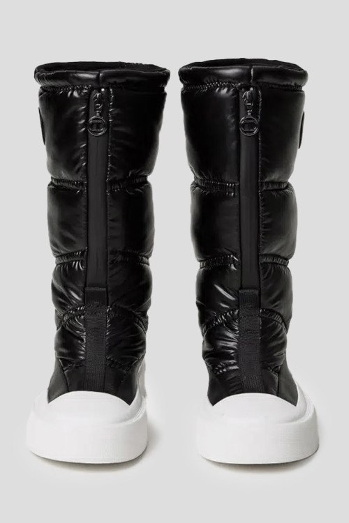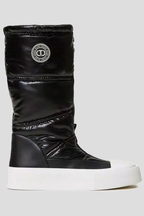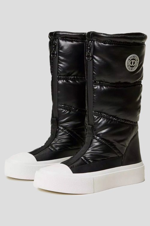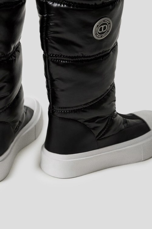 Женские черные сапоги из полиэстера от TWINSET (Твинсет). Стеганый дизайн, закругленный носок, резиновая подошва белого цвета, патч-лого, спереди застежка на молнию.