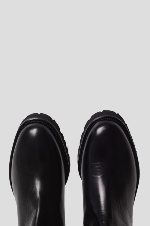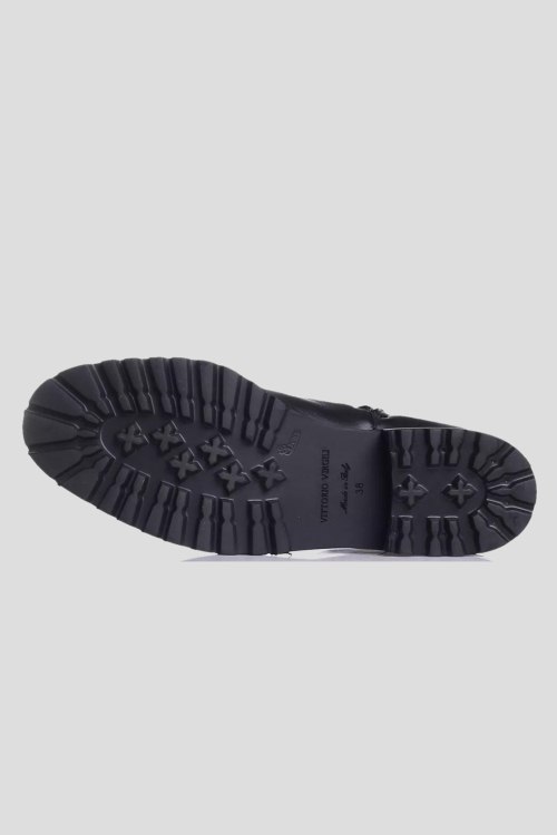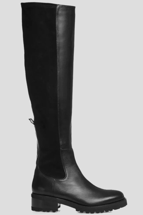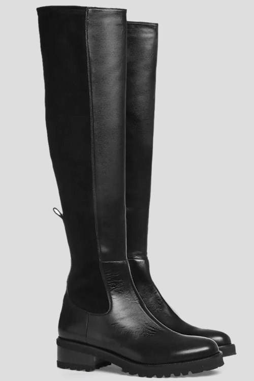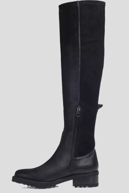 Детали: Женские черные сапоги из кожи и замши от Vittorio Virgili (Витторио Вирджили). Комбинация материалов, без застежки, закругленный носок, тракторная подошва. Размер 38: обхват голенища 32 см, каблук 2 см, высота 52 см