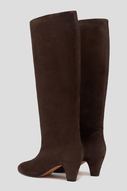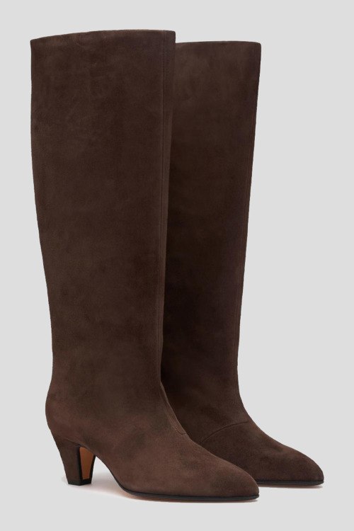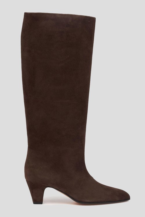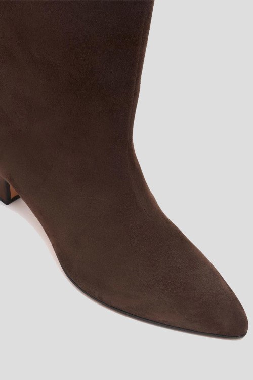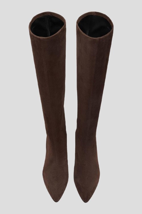 Детали: Женские коричневые сапоги из натуральной замши от Bally (Балли). Заостренный носок, модель без застежки, устойчивый каблук