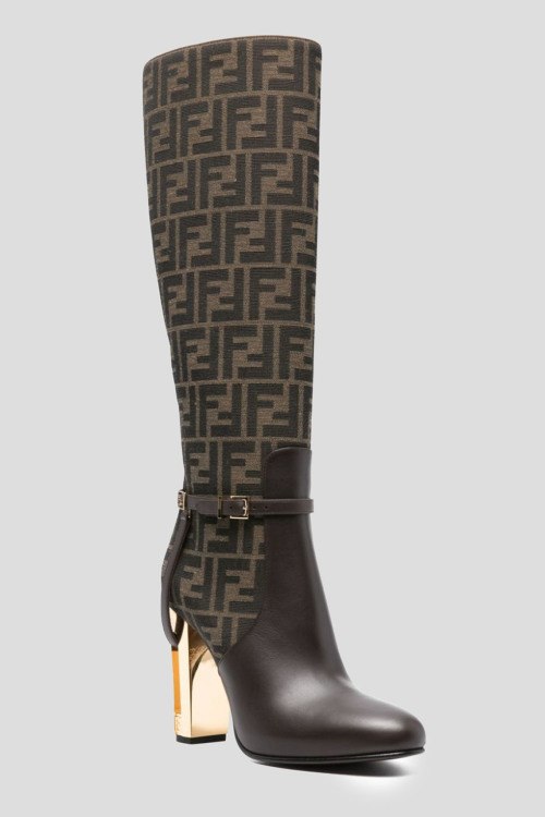 Детали: Женские коричневые сапоги из кожи и жаккарда Delfina от Fendi (Фенди). Комбинация материалов, монограмма бренда, застежка-молния сбоку, тонкий ремешок с пряжкой, закругленный носок, высокий золотистый каблук