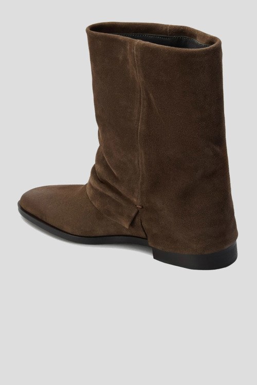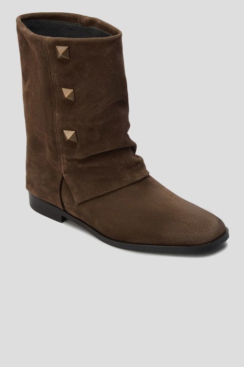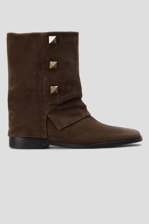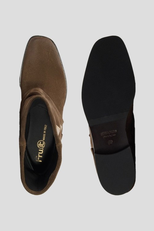 Детали: Женские коричневые замшевые полусапоги от Fru.It (Фру.Ит). Модель без застежки, декор шипами, квадратный носок, кожаная стелька. Высота каблука: 2.5 см, подошва: 1 см, высота голенища: 21 см