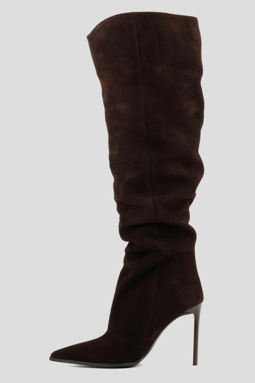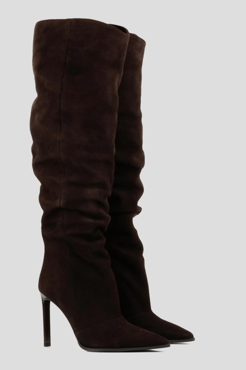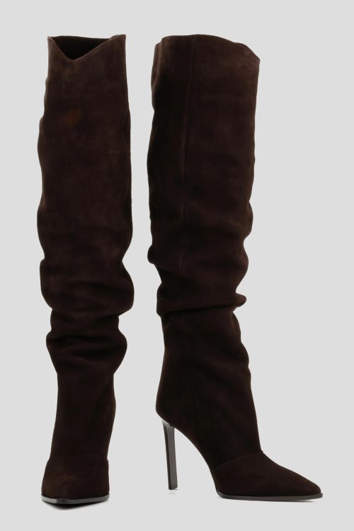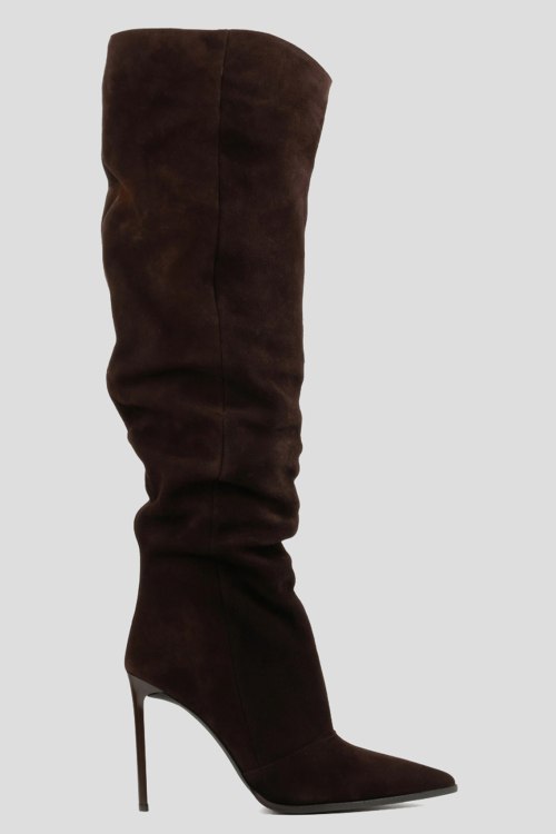 Детали: Женские темно-коричневые замшевые сапоги от Le Berdes (Ле Бердес). Модель без застежки, узкий носок, каблук-шпилька, байковая стелька. Высота каблука: 10 см. Замеры: длина стельки: размер 35 (23 см), 36 (23,5 см), 37 (24 см), 38 (24,5 см), 39 (25 см),40 (25,5)
