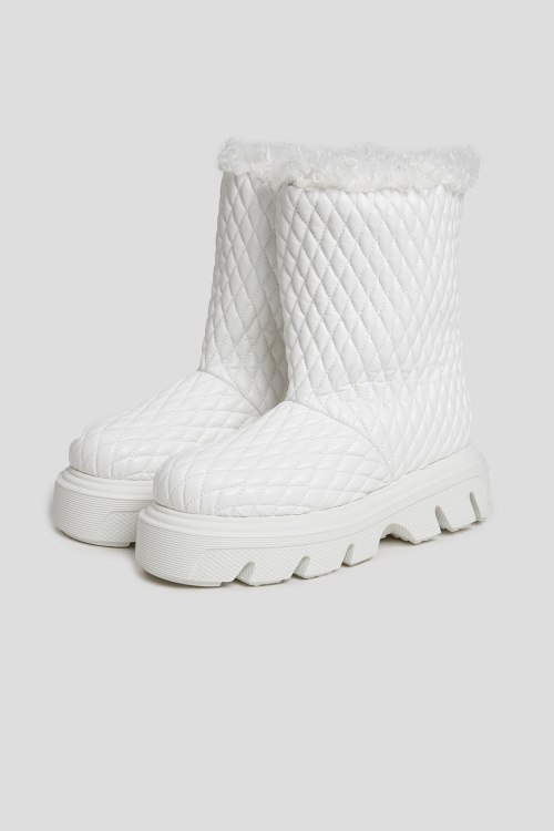 Женские белые сапоги из натуральной кожи от Casadei (Касадей). Стеганый дизайн, модель без застежки, тракторная подошва в тон изделия, внутри утепленные мехом, патч-лого