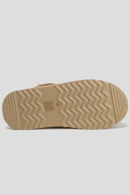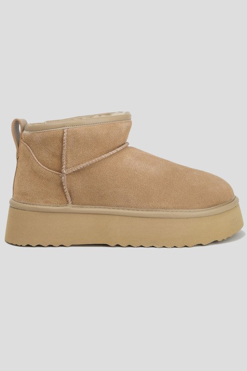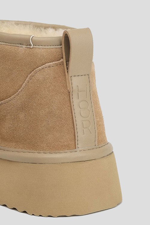Женские бежевые замшевые угги Vega от Hoor (Хур). Короткая модель, закругленный носок, петля для подтягивания сзади, внутри полностью на меху