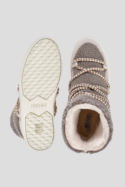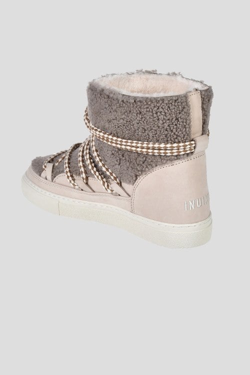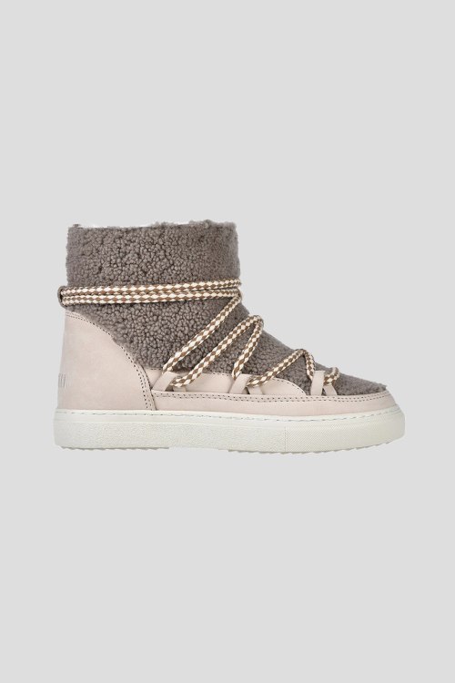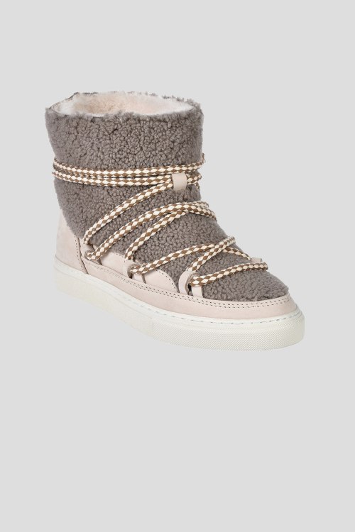Детали: Женские бежево-коричневые кожаные мунбуты на меху от Inuikii (Инуки). Комбинация цветов и материалов, меховая отделка, завязки вокруг ноги, закругленный носок, внутри на меху