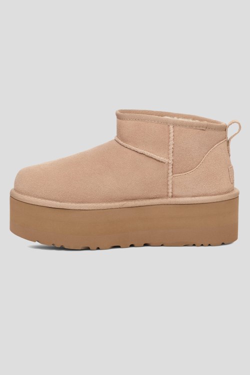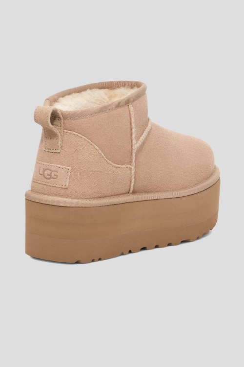Детали: Женские бежевые угги из натуральной кожи от UGG Australia (Угг Австралия). Закругленный носок, толстая подошва, шерстяная подкладка, петля для подтягивания, патч-лого. Высота платформы: 5 см