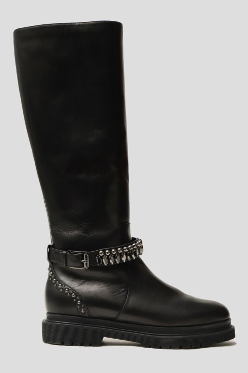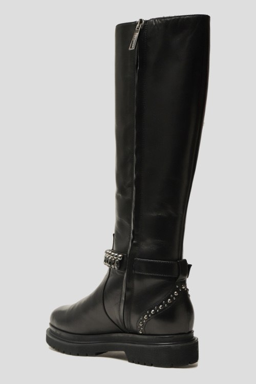 Детали: Женские черные кожаные сапоги от Baldinini (Балдинини). Закругленный носок, декоративный ремешок с металлической пряжкой с логотипом бренда, модель декорирована камнями, застежка на молнию, широкий каблук, ребристая подошва, утепленные мехом. Измерения: высота голенища-40 см, обьем-36 см