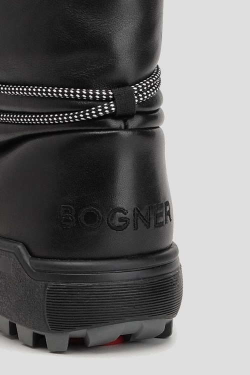Детали: Женские черные кожаные мунбуты на меху Chamonix от Bogner (Богнер). Модель из гладкой кожи, вышитый логотип на пятке, шнуровка вокруг ноги, закругленный носок, внутри на меху