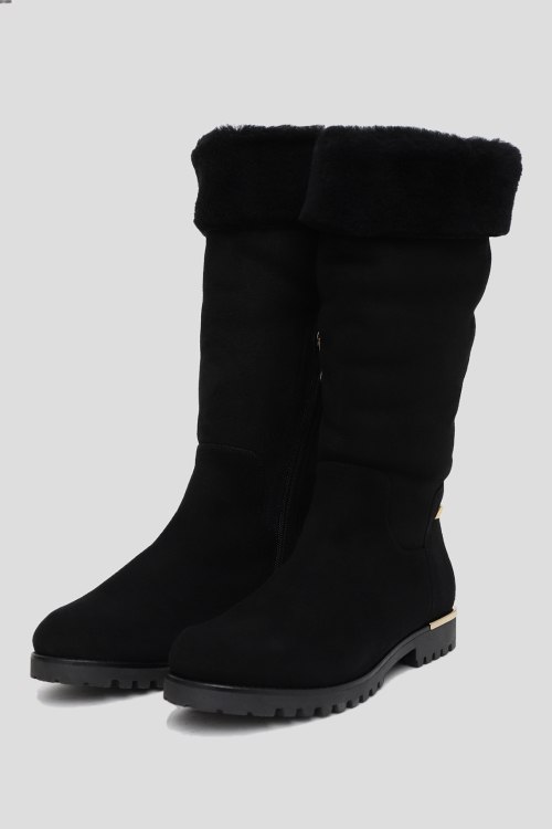 Детали: Женские черные сапоги из натуральной замши от Giorgio Piergentili (Джорджио Пьер Джентили). Закругленный носок, ребристая подошва, сбоку застежка на молнию, меховой отворот, золотистая металлическая вставка на каблуке с логотипом бренда, утепленные натуральным мехом