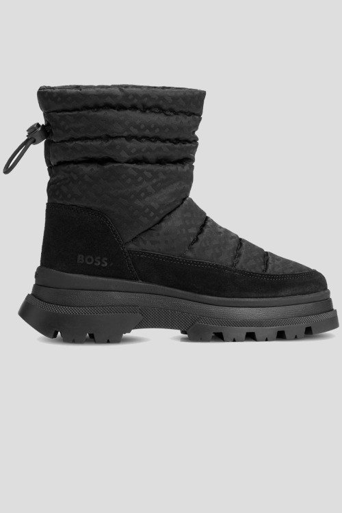 Женские черные текстильные сапоги на меху Foster от Hugo Boss (Хуго Босс). Стеганый дизайн, монограмма бренда по всей поверхности, замшевая вставка с логотипом, закругленный носок, верх на затяжке, внутри на меху