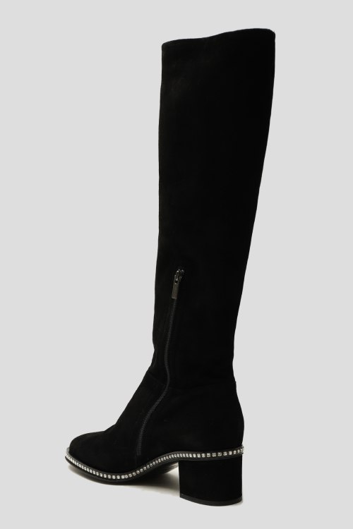 Детали: Женские черные сапоги на меху из натуральной замши от Le Silla(Ле Силла). Лаконичный дизайн, широкий устойчивый каблук, закругленный носок, модель с застежкой на молнию сзади, декорированы кристаллами, утепленные мехом. Измерение: высота каблука: 5 см, высота голенища: 44 см, полуобхват голенища: 18,5 см