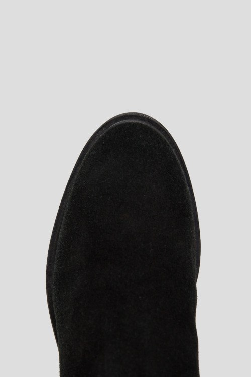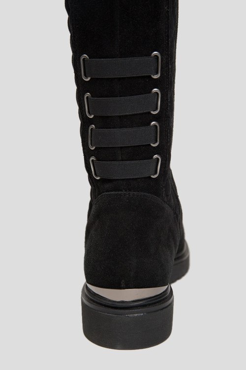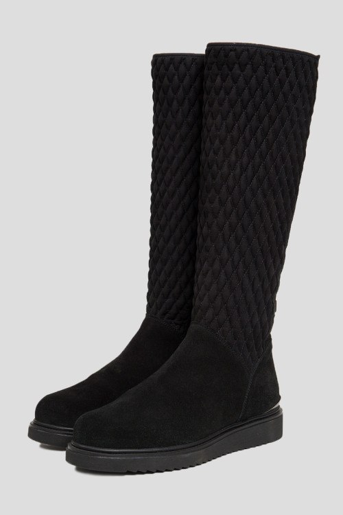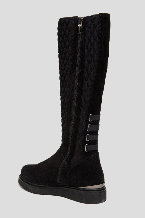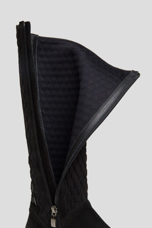 Детали: Женские черные замшевые сапоги на меху от Marzetti (Марзетти). Текстильная стеганая вставка спереди, застежка-молния сбоку, миндалевидный носок, внутри на меху (еврозима). Замеры: высота голенища: 39 см, ширина голенища (обхват): 33,5 см
