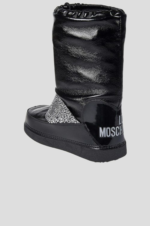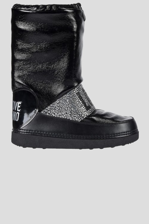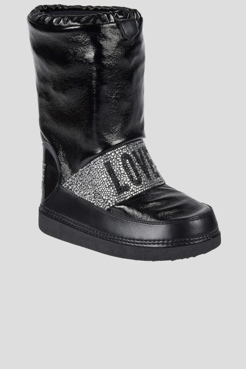 Детали: Женские черные мунбуты из экокожи от Love Moschino (Лав Москино). Глянцевый эффект, логотип из кристаллов, закругленный носок, высокая подошва
