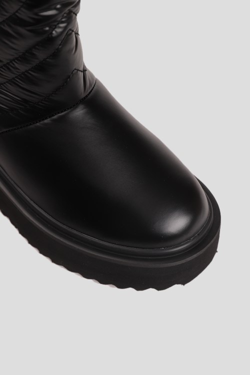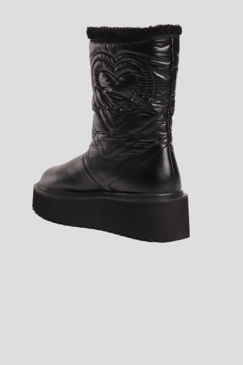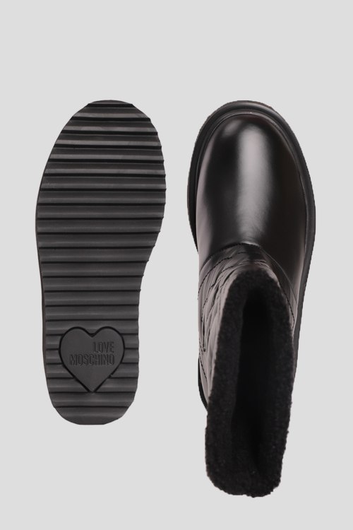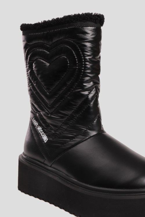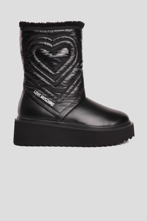 Детали: Женские черные текстильные утепленные полусапоги от Moschino (Москино). Стеганый узор, принт с логотипом, без застежки, закругленный носок, утепление искусственной шерстью. Платформа: 5.5 см