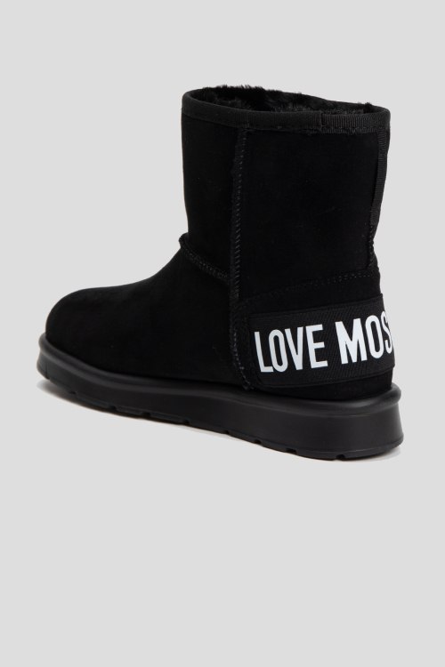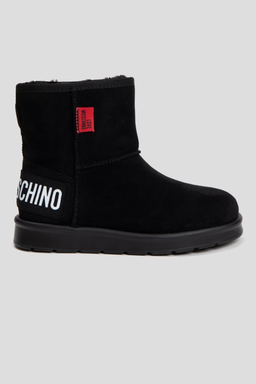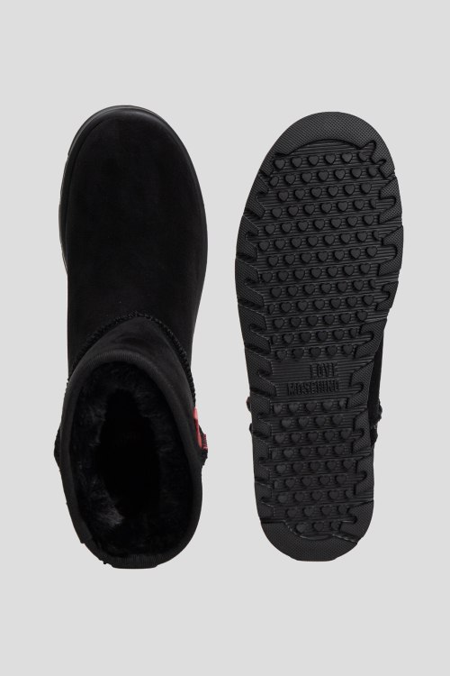 Детали: Женские черные замшевые короткие сапоги на меху от Love Moschino (Лав Москино). Логотип сбоку и на пятке, без застежки, закругленный носок, внутри на меху. Высота каблука: 3 см, высота голенища: 15 см